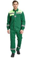 Мужской костюм состоит из куртки и брюк. Кокетка на куртке отделана материалом контрастного цвета. По низу кокетки настрочена светоотражающая полоса. Застёжка на пяти пуговицах расположена по центру. Воротник – отложной. На передней части куртки имеются накладные карманы, из них один на груди, два других боковые. Рукава снабжены манжетами и налокотниками, пуговичной застёжкой. Брюки — прямые, с пришитым поясом и пуговичной застёжкой. Оснащены наколенниками и парой накладных косых карманов.